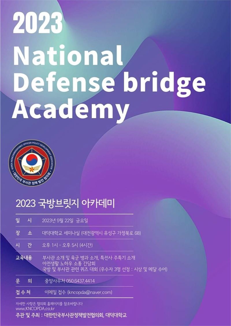 대한민국부사관정책발전협의회 제공 대한민국부사관정책발전협의회(의장 윤성열)가 오는 9월 22일(금) 오후 1시, 대전 대덕대학교 세미나실에서 '2023 국방브릿지 아카데미' 행사를 개최한다. 요즘 국방인력이 감소함에 따른 부사관 소개 및 육군 병과 소개, 특전사 주특기 소개등 야전생활 노하우 소통 간담회를 하며 국방 및 부사관 관련 퀴즈대회로 시상 및 메달 수여를 할 계획이다. crystal-ent@naver.com 2 0 KCM today 서윤호기자 crystal-ent@naver.com 서윤호기자의 기사 더보기 저작권자 ⓒ KCM today, 무단 전재 및 재배포 금지