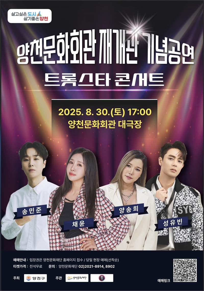 2025년 8월 30일, 양천구문화회관이 재개관을 맞아 특별한 기념 공연을 선보입니다. 바로 '트롯스타 콘서트'로, 팬들에게 큰 사랑을 받고 있는 트롯 가수들이 총출동해 화려한 무대를 꾸밀 예정입니다. 이번 공연에는 최근 신곡 **'머리어깨무릎발'**을 발표하고 활발히 활동 중인 가수 성유빈이 출연해 팬들과의 첫 콘서트