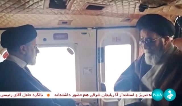 에브라힘 라이시(왼쪽) 이란 대통령이 19일 동아제르바이잔주 바르즈건 지역에서 열린 기즈 갈라시 댐 준공식에 참석한 뒤 타브리즈로 돌아오기 위해 헬기에 탑승해 있다. 라이시 대통령과 호세인 아미르압돌라히안 외무장관 등을 태운 헬기는 원인을 알 수 없는 사고로 산악 지대에 추락했다. 이란 국영TV IRINN 캡처