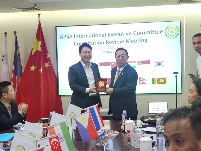 동중영 (사)한국경비협회 중앙회장(왼쪽)이 양진카이(APSA 의장)로 부터 APSA 국제집행위원회의 참석 기념패를 받고 있다.