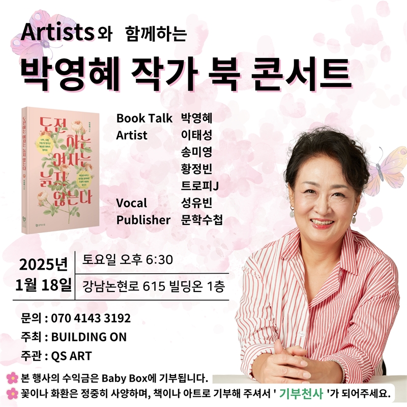 아티스트들과 함께 하는 박영혜 작가 북콘서트가 18일 오후6시 30분 서울 강남구 논현로 615 빌딩온 1층에서 열린다.