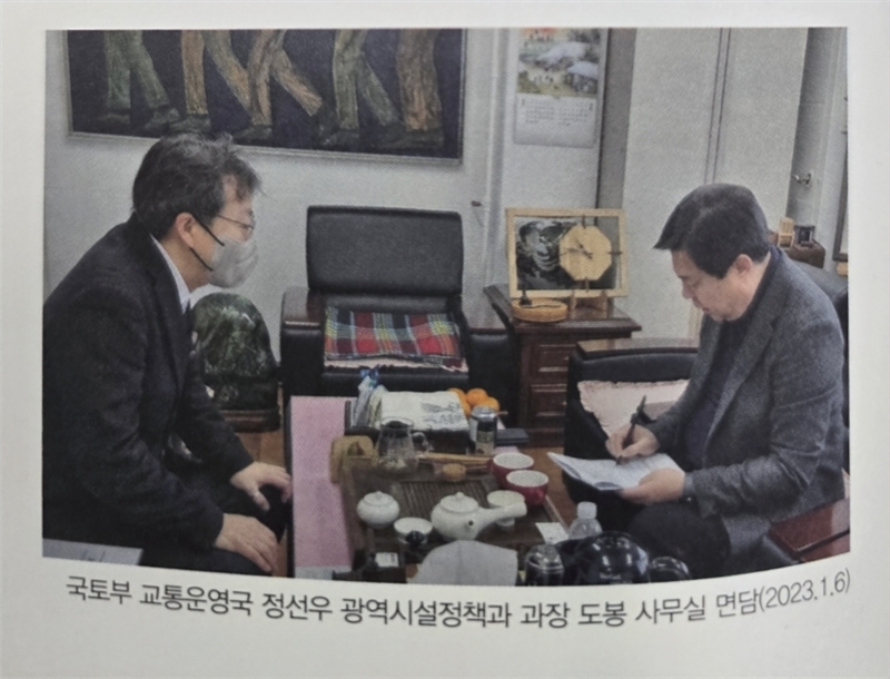 ㆍ원희룡 장관, 실무진 3개 팀 도봉에 파견 -1.6국토교통부 교통운용국 관역시설정책과 정선우과장(우이방학경전철사업) -1.11 국토교통부 주택토지실 남영우 토지정책관(1호선 방음벽) -2.16 국토교통부 이윤상 철도국장, 안재혁과장(GTX사업) ㆍ5.30 수요예측조사 34.13% 증가 기관통보(기재부→서울시) -4.27 우이방학경전철 수요예측조사 43.195% 증가 정보 확인 -5.19 수요예측조사 34.13% 증가 정보 확인